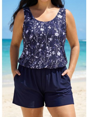 Baroque Pattern Print Vintage Wide Straps Pocket Curvy Swimsuit One Piece Swim Romper