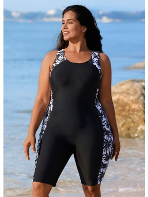 Embrace resort style with this knee-length one-piece swimwear featuring a scoop neck and removable pads. Coconut tree print on shoulders and sides contrasts solid black. Perfect for plus size womens bathing suit and curvy women swim. Explore now.