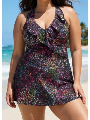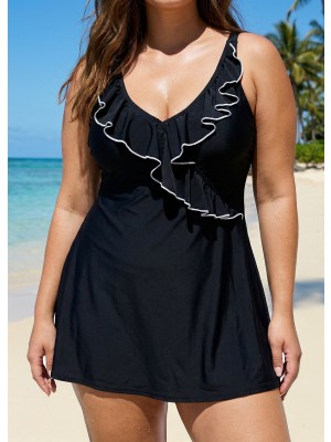 Black And White Ruffles Plus Size Fashion Swimdress Top