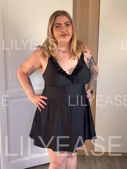 LILYEASE ® Black Plus Size Solid Color V Neck Ruffle One Piece Swimdress