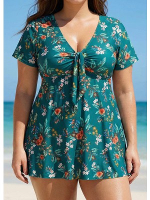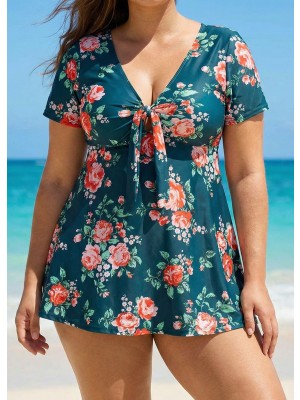Make a splash in this two piece bathing suit for women! The V-neck leaf print top features a charming bust tie detail, paired with low-rise swim briefs. Removable pads offer comfort, making it a conservative swimsuit ideal for curvy women.