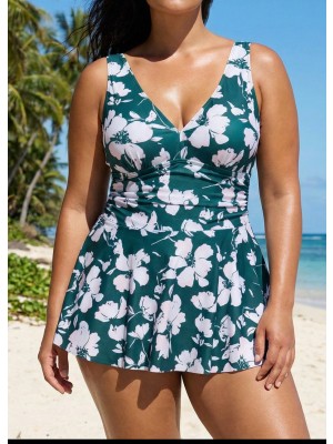 Flatter your figure in this vibrant one piece swimsuit with skirt! The V-neck showcases a colorful leaf print and tummy control ruching for a sleek silhouette. An underwire bra offers optimal support, perfect for curvy women seeking confidence.