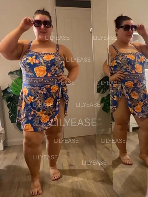 Final Sale LILYEASE ® Navy White Floral Vintage Side Knot Side Slit Curvy Women's Swimsuit One Piece Swimdress