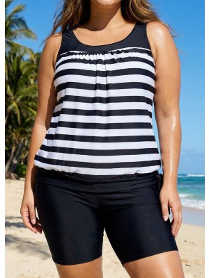 Plus Size Black And White Striped Print Sports Tankini Top