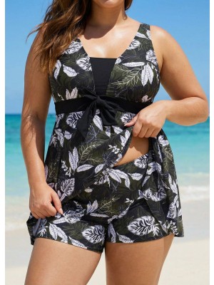 Plus Size Black Leaf Print Vintage Swimsuit Swimdress Set