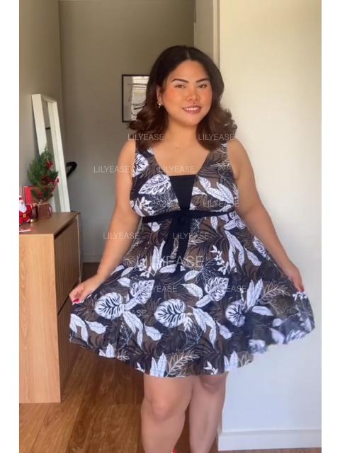 Final Sale LILYEASE ® Plus Size Black Leaf Print Vintage Swimsuit Swimdress Set