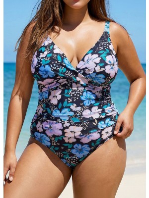 Dive into effortless elegance! This blue floral one-piece swimsuit has a V-neck, adjustable straps, removable pads, and tummy control with flattering wrap and ruched cross-front design. Ideal plus size bathing costumes choice.