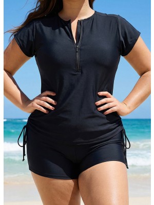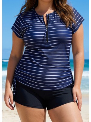 Plus Size Zip Front Striped Short Sleeves Rash Guard Tankini Top