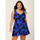 Purple Scoop Neck Plants Print Tie Front Modest Plus Size Swim Dress Set