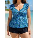 Blue Floral Print V Neck Ruffle Sleeve Plus Size Tankini Top