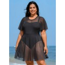 Plus Size Black High Neck Mesh Sleeves One Piece Swimdress
