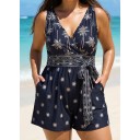 Curvy Black Palm Tree Print Flattering Wrap Pocket Curvy Swimsuit One Piece Swim Romper