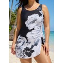 Curvy Black And White Floral Square Neck Modest Drawstring Swimsuit One Piece Swimdress