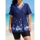 Plus Size Navy Floral V Neck Upf50+ Short Sleeves Modest Padded Swimsuit Long Tankini Top