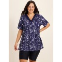 Curvy Purple Floral V Neck Upf50+ Short Sleeves Flattering Padded Swimsuit Long Tankini Top