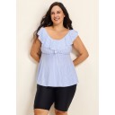 Plus Size Blue Stripe Print Scoop Neck Built In Bra Ruffle Women's Swimsuit Tankini Top