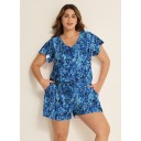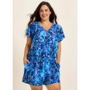 Blue Leaf V Neck Upf50+ Short Sleeves Vintage Pocket Curvy Swimsuit One Piece Swim Romper