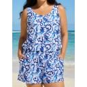 Curvy Blue And White Floral Vintage Wide Straps Pocket Swimsuit One Piece Swim Romper