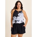 Black And White Floral High Neck Vintage Pocket Plus Size Swimsuit One Piece Swim Romper
