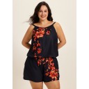 Curvy Red Tropical Floral Keyhole Neck Modest Pocket Women's Swimsuit One Piece Swim Romper