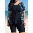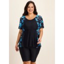 Plus Size Blue Floral Upf50+ Short Sleeves Modest Women's Swimsuit Shirt Tankini Top