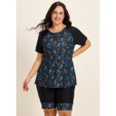 Black Floral Upf50+ Short Sleeves Vintage Curvy Women's Swimsuit Shirt Two Piece Tankini Set