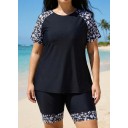 Plus Size Black Floral High Neck Upf50+ Short Sleeves Swimsuit Shirt Two Piece Tankini Set