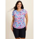 Pink Floral High Neck Short Sleeves Zipper Drawstring Curvy Swimsuit Uv Shirt Tankini Top