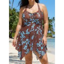 Brown Blue Tropical Leaf Modest Drawstring Asymmetrical Hem Plus Size Swimsuit One Piece Swimdress