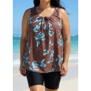 Curvy Brown Blue Tropical Leaf Vintage Wide Strap Loose Fit Plus Size Swimsuit Long Tankini Top