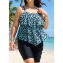 Blue Green Floral Vintage Layered Ruffles Curvy Women's Swimsuit Tankini Top