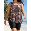 Brown Floral Scoop Neck Flattering Drawstring Curvy Women's Swimsuit Tankini Top