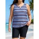 Navy Stripe V Neck Sleeveless Modest Padded Plus Size Women's Swimsuit Tankini Top
