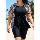 Black Plants Scoop Neck Upf50+ Short Sleeves Padded Plus Size Women's Swimsuit Shirt Tankini Top