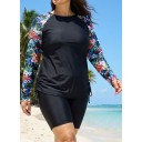 Plus Size Black Floral Upf50+ Long Sleeves Modest Women's Swimsuit Tankini Top