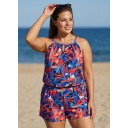 Blue And Red Tropical Leaf High Neck Pocket Plus Size Women's Swimsuit One Piece Swim Romper