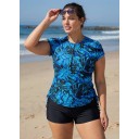 Curvy Blue Tropical Leaf Print Upf50+ Short Sleeves Zipper Drawstring Swimsuit Tankini Top