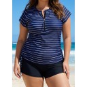 Plus Size Zip Front Striped Short Sleeves Rash Guard Tankini Top