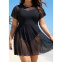 Plus Size Black High Neck Mesh Sleeves One Piece Swimdress