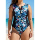 Blue Tropical Print Flattering With Zipper Rash Guard One Piece Swimsuit