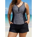 Black Striped Zip-Up Sporty With Pocket Rash Guard Tankini Set