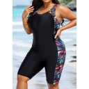 Plants Print Scoop Neck Athletic Boyleg Tummy Rash Guard Control One Piece Swimsuit