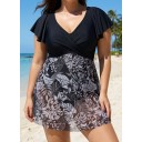 Black And White Print Short Sleeve Cross Front Ruffle One Piece Swimdress
